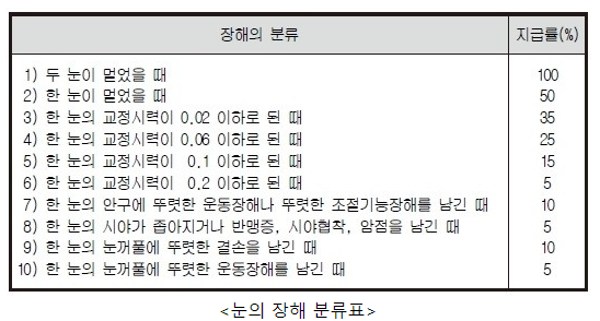 눈의 경우는 시력에 대한 보상, 안구 조절 또는 운동장해와 일부 안면부 추상장해까지 보상하고 있습니다.