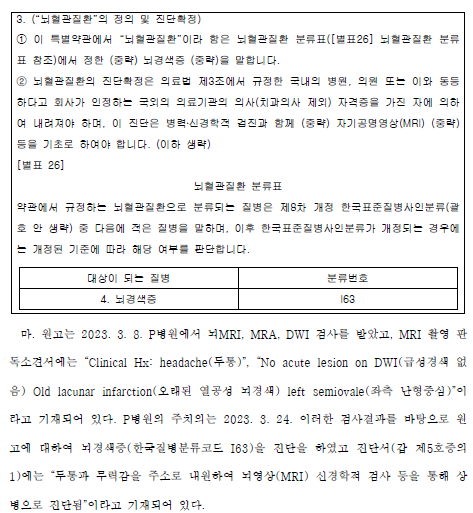 법원은 [ "한국표준질병․사인분류표에 의하더라도 “MRI 검사결과 열공성 뇌경색으로 기술되어 있으나 추가적인 임상 정보가 없다면 R90.8로 분류할 수 있다”는 취지로 기재되어 있을 뿐, 뇌졸중의 전형적 증상이 없는 열공성 뇌경색의 경우 I63 코드로 분류되는 ‘뇌경색증’에서 제외되는지 여부는 명확하게 기재되어 있지 않은 점 등에 비추어 보면, P병원 의사의 진단이 잘못되었다고 단정하기 어렵다.